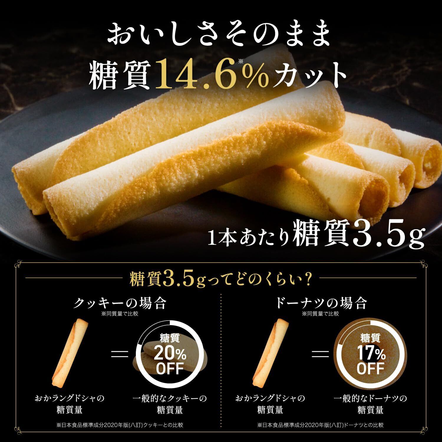 【おすすめの食べるタイミングと推奨事項】お腹がすいて眠れない時、ダイエット中どうしても甘いものが食べたくなった時1?2本、コップ一杯の水やお飲み物と一緒に食べてください。コーヒーなどとご一緒に頂くことで、よりおかラングドシャの美味しさが引き立ちます。