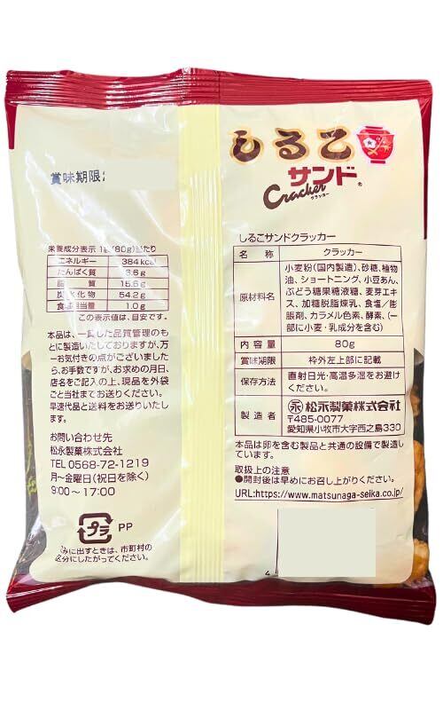 しるこサンドクラッカー:小麦粉(国内製造)、砂糖、植物油、ショートニング、小豆あん、ぶどう糖果糖液糖、麦芽エキス、加糖脱脂練乳、食塩、/膨張剤、カラメル色素、酵素、(一部に小麦・乳成分・を含む)